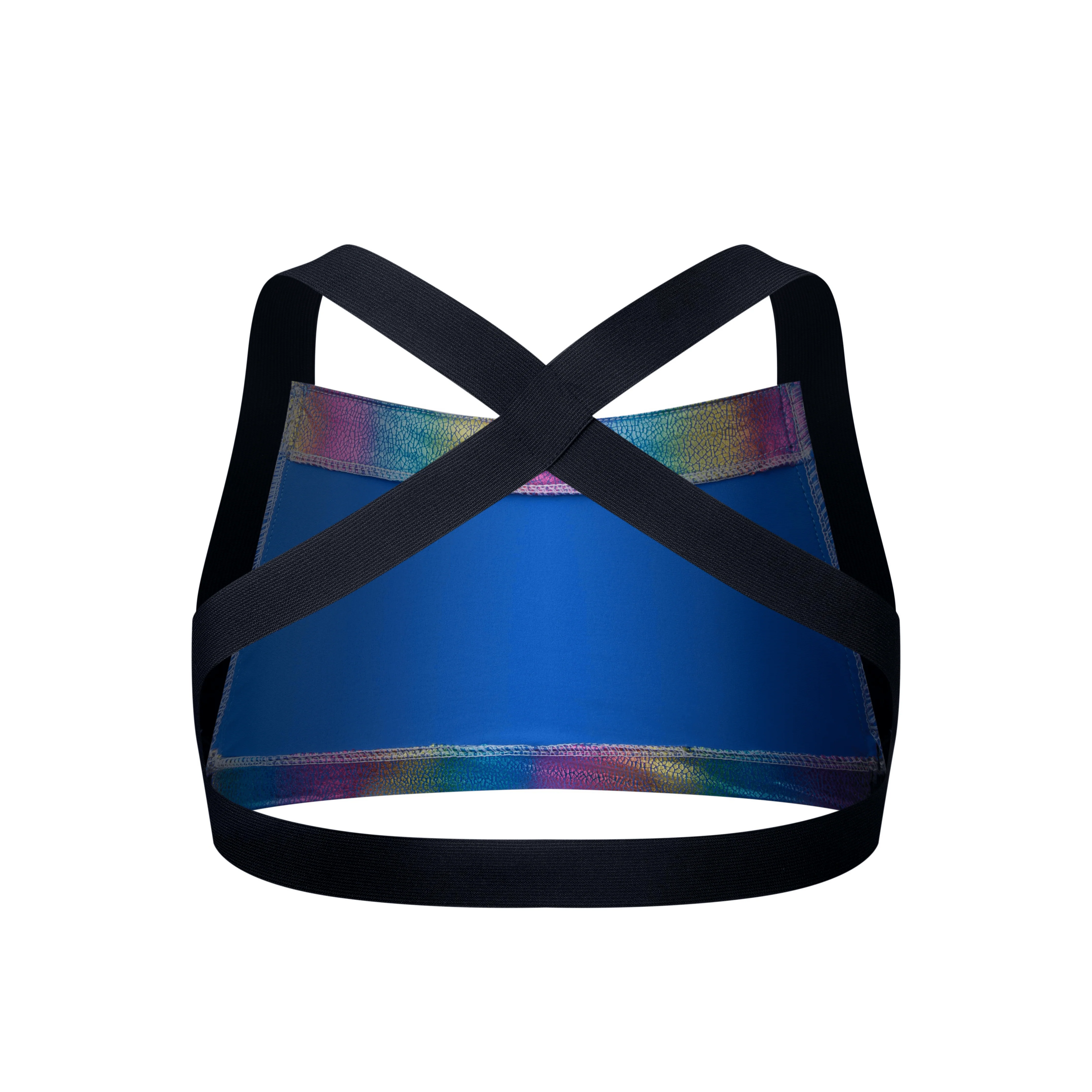 Featuring an ergonomically designed rubber chest plate that arcs to accentuate the pectoral muscles, this harness is crafted with elastic straps arranged in an "X" across the back and fitted with Silver rounded rings at the sides. Topped with our branded woven label on the left hand side.
